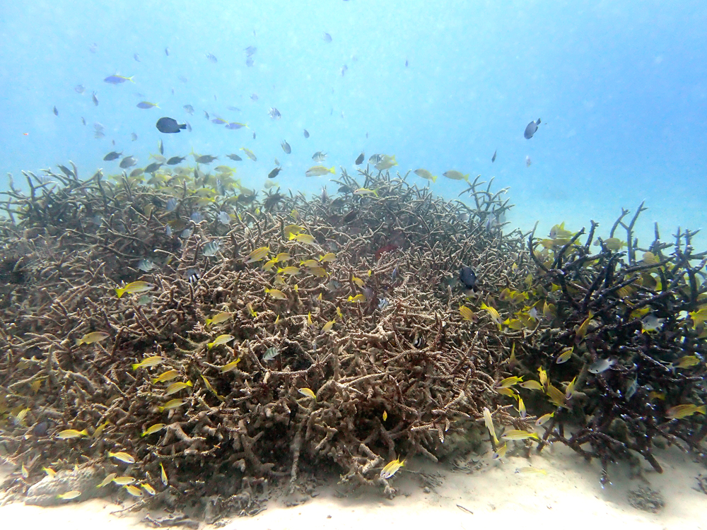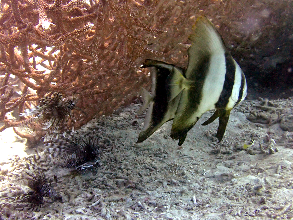 倒れたサンゴの陰にはアカククリの若い子たちとハナミノカサゴがひっそり…